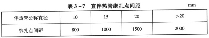 伴熱管應與主管平行安裝,并應自行排液。當一根主管需要多根伴熱管伴熱時,伴熱管之間的距離應固定。水平伴熱管宜安裝在主管下方或靠近支架的側面,鉛垂伴熱管應均勻分布在主管周圍,不得將伴熱管直接點焊在主管上,而可采用綁扎帶或鍍鋅鐵絲等固定在主管上。彎頭部位的伴熱管綁扎帶不得少于3道,直伴熱管綁扎點間距應符合表3一7的規(guī)定。