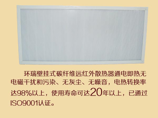 環(huán)瑞壁掛式碳纖維電暖器是采用先進技術研制開發(fā)的一種新型電采暖的專利產(chǎn)品。采用高科技長絲碳纖維材料制成,具有性能穩(wěn)定,安全可靠,環(huán)保節(jié)電,經(jīng)濟實用等特點。屬于國家認定的綠色環(huán)保電加熱產(chǎn)品。