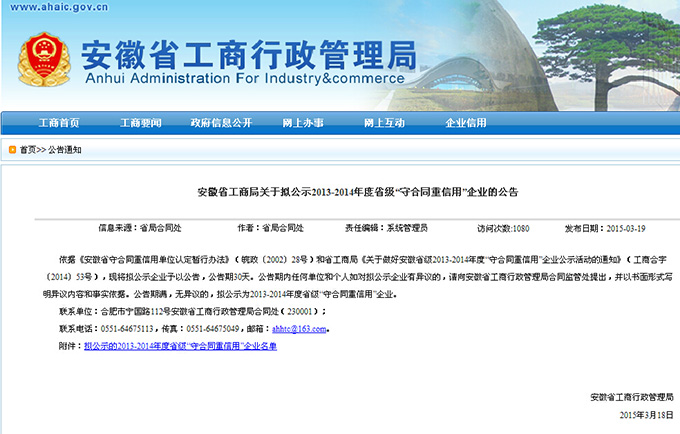安徽省工商行政管理局網站的公告信息: